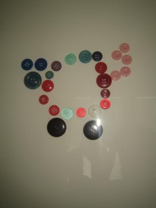 Tässä meidän nappitaulu. Minun ja lasten kanssa tekemä. Käytiin aivan erikseen ostamassa tarpeet näihin. Eli ikeasta raamit ja läheisestä punaisenarmeijan kirpputorilta napit. Tämä on hyvä tapa käyttää vanhat ylimääräiset napit… 🙂
