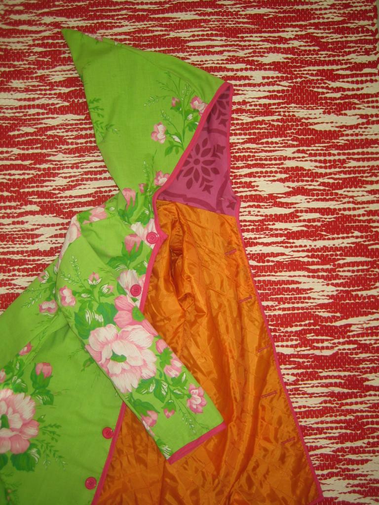 Tämä kuva ei kyllä laita takkia oikeaan arvoonsa! Tein hiippahupullisen, kellohelmaisen, nilkkapituisen takin vanhasta lakanakankaasta meidän neidille.